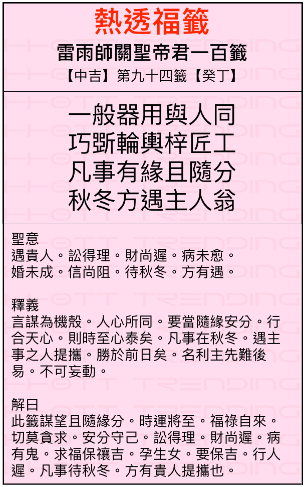籤號:【中吉】第九十四籤【癸丁】 認領