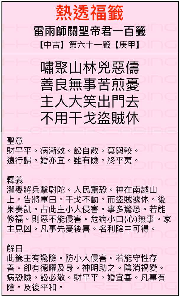 籤號:【中吉】第六十一籤【庚甲】
